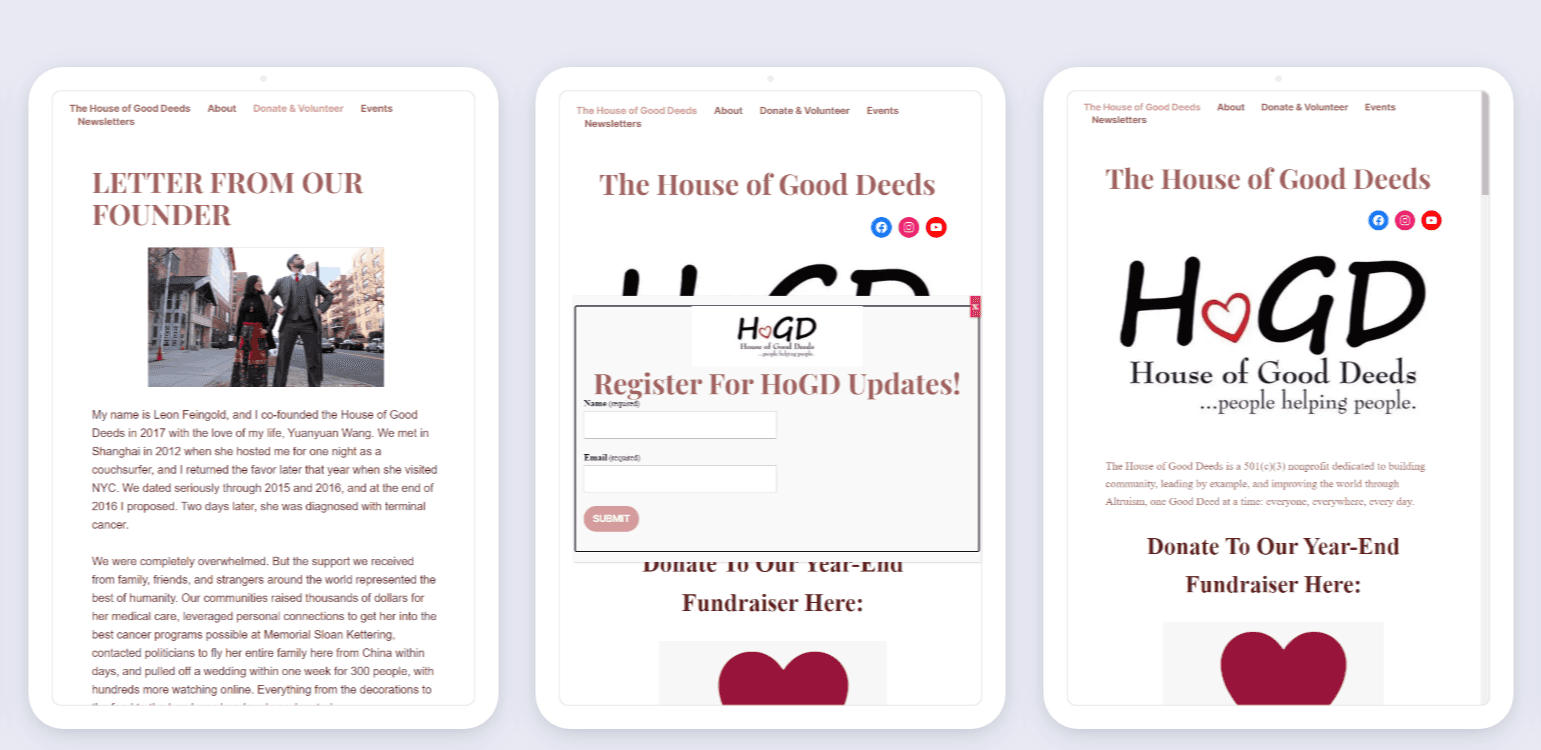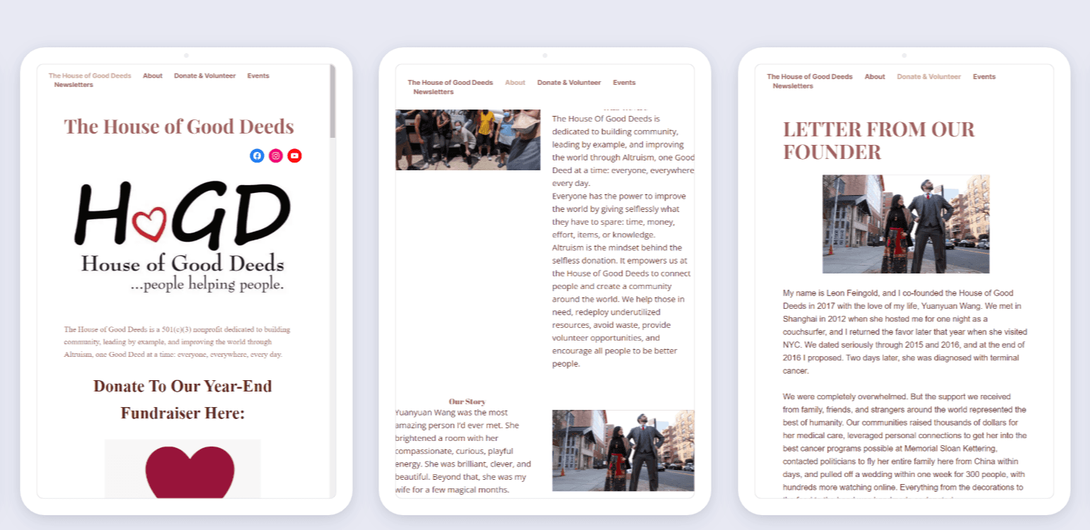 I led the redesign of the House of Good Deeds website using WordPress, with a focus on enhancing usability and improving visual appeal to better engage visitors and donors. This project involved modernizing the site's layout, ensuring responsive design across all devices, and streamlining navigation to make it easier for users to learn about the organization’s mission and get involved.